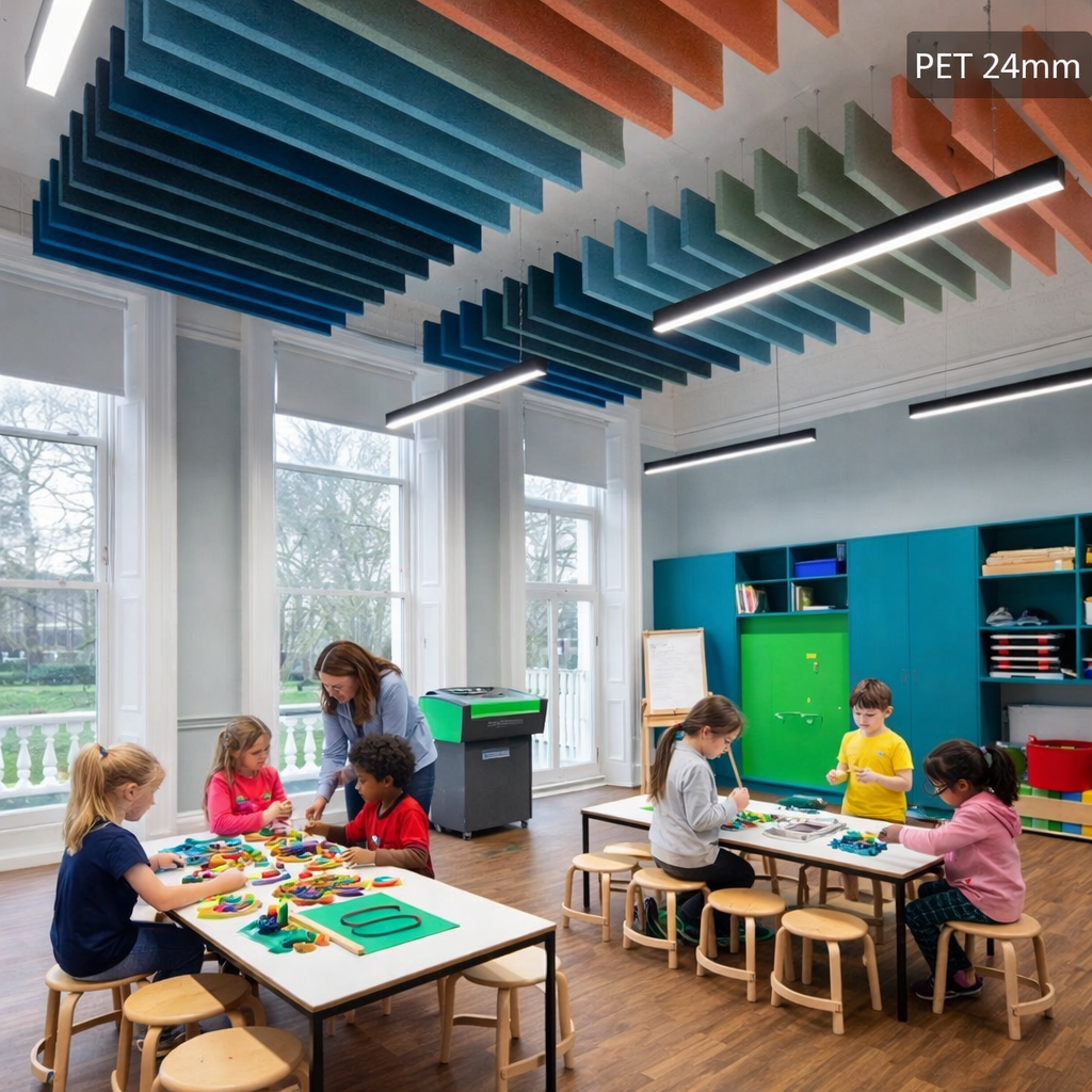 Floating suspended PET acoustic panels that appear to hover within the space — architectural drama combined with exceptional acoustic performance.