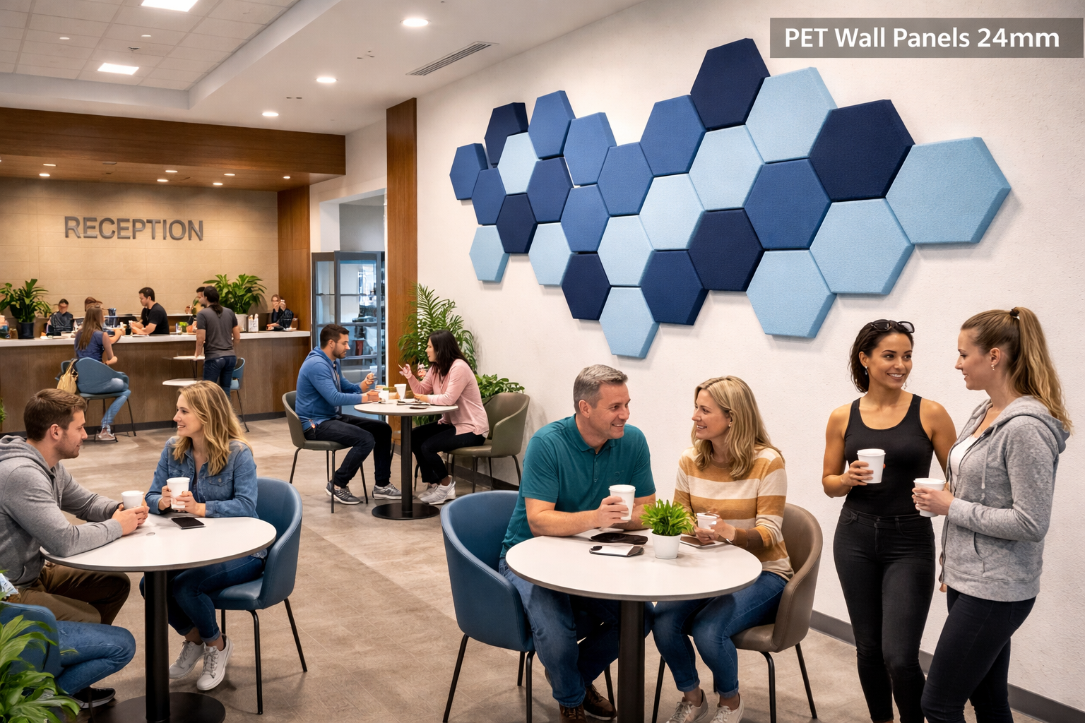 Decorative PET acoustic wall panels that reduce reverberation and define commercial interiors. 21 shapes, 41 colours, Class A sound absorption — acoustic panels for offices, education and commercial spaces.