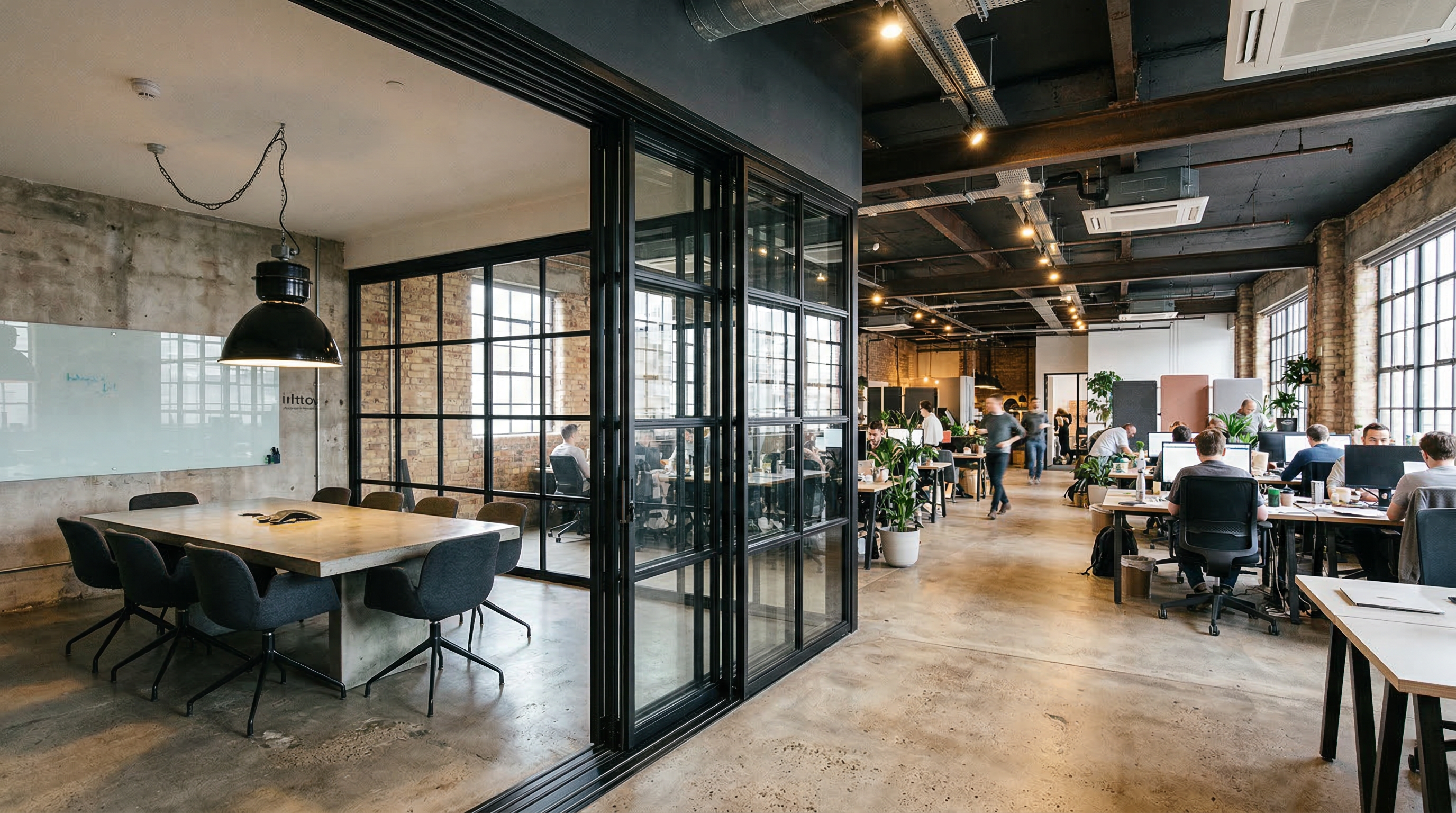The client required glazed acoustic sliding partitions that could deliver meaningful sound separation while complementing an industrial-chic refurbishment. Standard frameless glazed systems lacked the visual weight the design called for — the brief demanded the slim-profile, grid-patterned Crittall aesthetic without sacrificing acoustic performance.