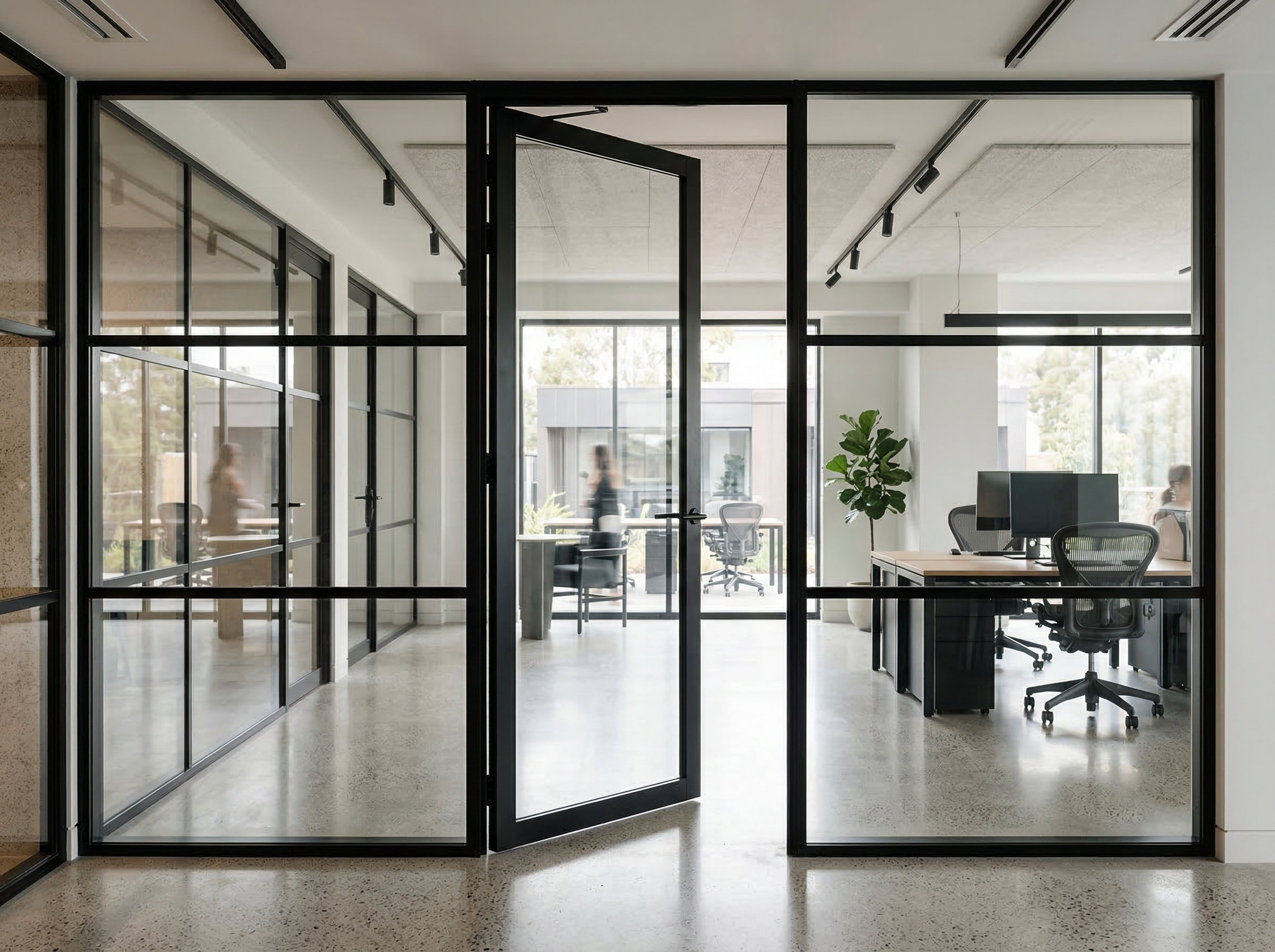 The MG900 can function as a framed single glazed door within a fixed glass partition system used in modern office interiors. This capability allows architects to maintain a completely consistent design language across an entire glazed office partition — incorporating functional access doors without breaking the visual continuity of the glazed wall.