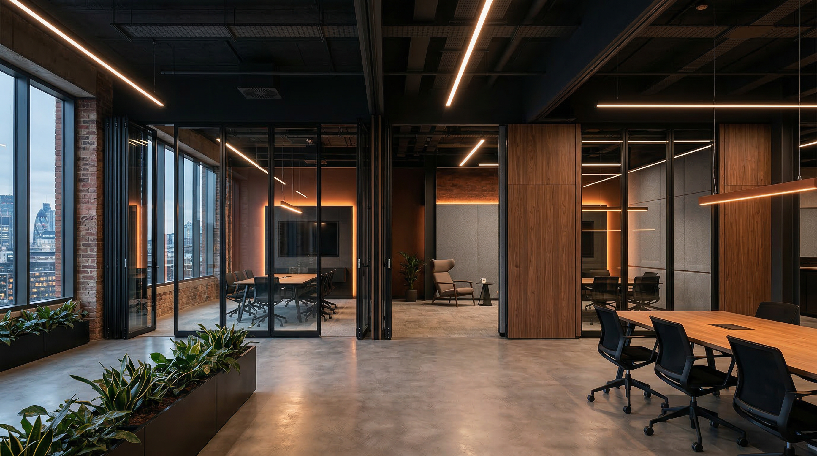 Glass sliding and folding partitions that allow natural light to flow between spaces while maintaining acoustic separation. Popular in offices and hotels.